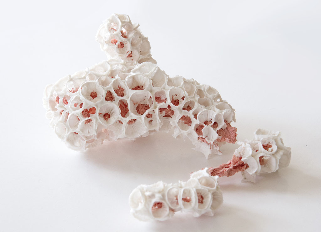 Jeg lader naturen smelte sammen med kunsten, idet jeg citerer koralens formsprog, men bruger også porcelænets materielle følsomhed målrettet under brændingen: der opstår sår, revner, brud og abnormiteter i værkerne, som synes at stå i vejen for æstetikken og udløser mange associationer hos beskueren.